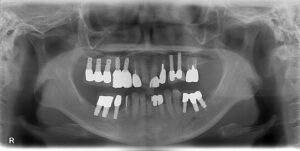 欠損部はブリッジにて治療されていましたが、両側の支台歯部分に負担がかかり根の先が化膿していたため、神経の治療も必要になっていました。