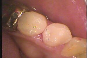 二本ともセラミックインレーにて修復しました。審美的だけでなく、セラミックは表面性状がツルツルしており、かぶせ、詰め物と歯との間に二次的虫歯が出来にくいといった点でも有利な材料となります。